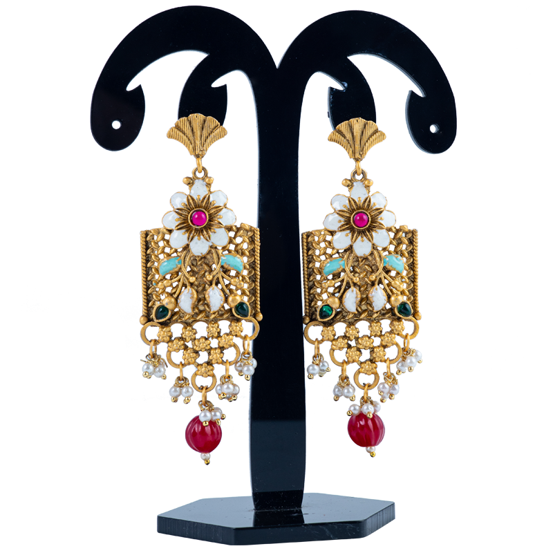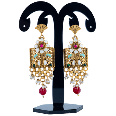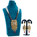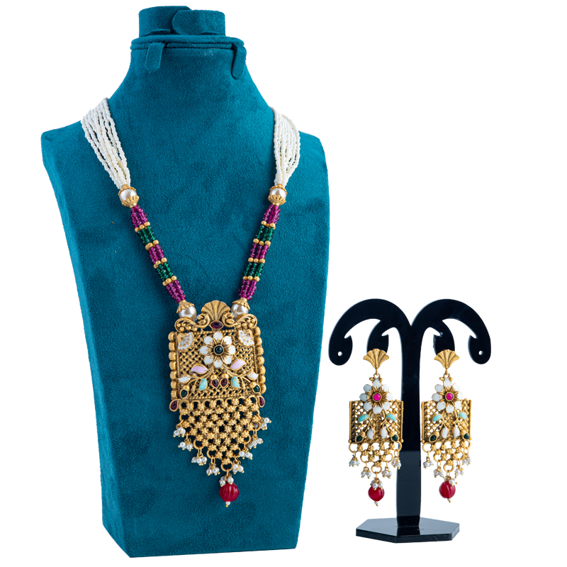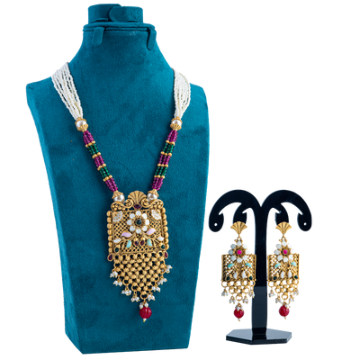 This breath taking "Royal Bloom Kundan Necklace Set" is a masterpiece of traditional elegance and craftsmanship. The necklace features multiple strands of delicate white beads...